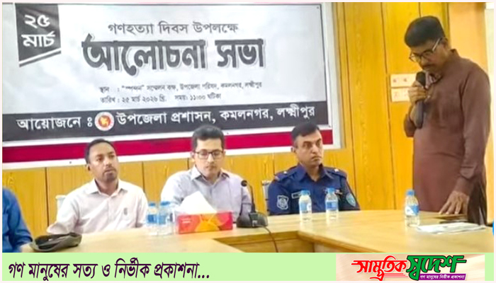 কবির হোসেন রাকিব ,কমলনগর (লক্ষ্মীপুর) প্রতিনিধি: লক্ষ্মীপুরের কমলনগরে যথাযথ মর্যাদায় ২৫ মার্চ ‘গণহত্যা দিবস’ পালিত হয়েছে। দিবসটি উপলক্ষে উপজেলা প্রশাসনের উদ্যোগে এক বিশেষ আলোচনা সভা অনুষ্ঠিত হয়।